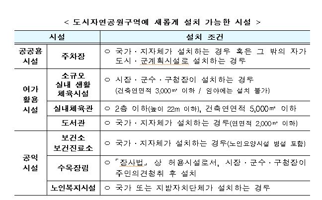 입법예고된 개정안을 통해 도시자연공원구역에서도 ‘개발제한구역법’과 동일하게 주차장, 실내생활 체육시설, 실내체육관을 설치할 수 있게 된다. 도서관, 보건소‧보건진료소 등의 공익시설과 수목장림, 노인복지시설 등 생활SOC 시설을 허용함으로써 도시자연공원구역의 토지 활용도도 높인다. 다만 여가활용시설인 실내 생활체육시설은 건축연면적 3,000제곱미터 이하, 실내체육관은 건축연면적 5,000제곱미터, 높이는 22미터 이하, 도서관은 연면적 2,000제곱미터 이하로 제한된다.