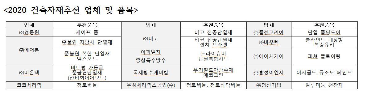 2020년도 건축자재추천 업체 및 품목이 발표됐다. 건축자재업체는 13곳이며 품목은 15개(신규 10개, 갱신 5개)다.