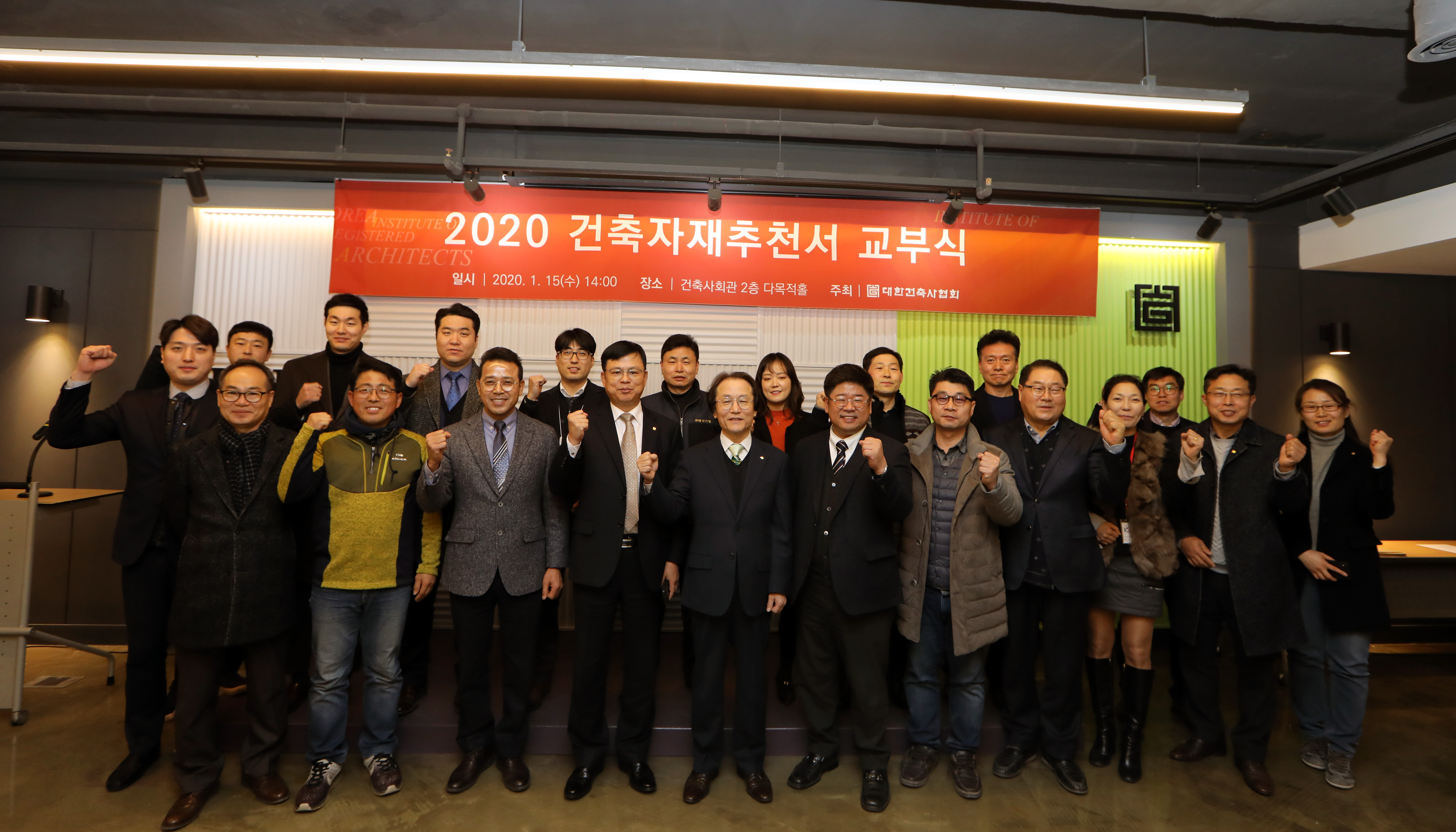 대한건축사협회는 1월 15일 건축사회관 다목적홀에서 '2020 건축자재추천서 교부식'을 열고 선정된 업체에 추천서를 전달했다.