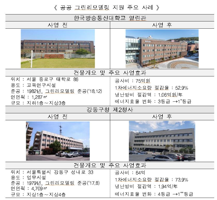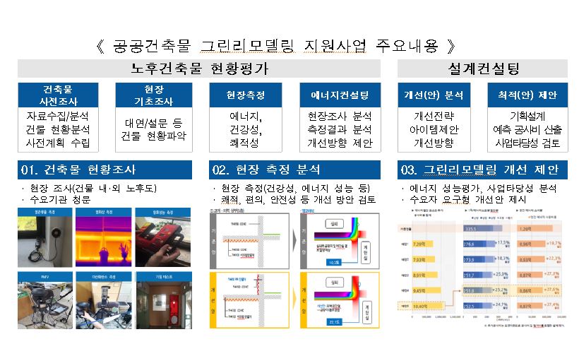 그린리모델링 지원사업은 리모델링을 구상 중인 노후 공공건축물을 대상으로 에너지 성능개선을 위한 기술적‧행정적 지원이 이뤄지는 사업이다. 2013년부터 시행해 대학교 건물과 지자체 청사 등 다양한 유형의 공공건축물을 대상으로 현재까지 130개소 약 90억 원 규모의 사업이 추진됐다. 해당 사업을 통해 노후건축물의 에너지 성능 개선이 이뤄졌고, 최대 에너지 성능개선률은 80%를 달성했다.