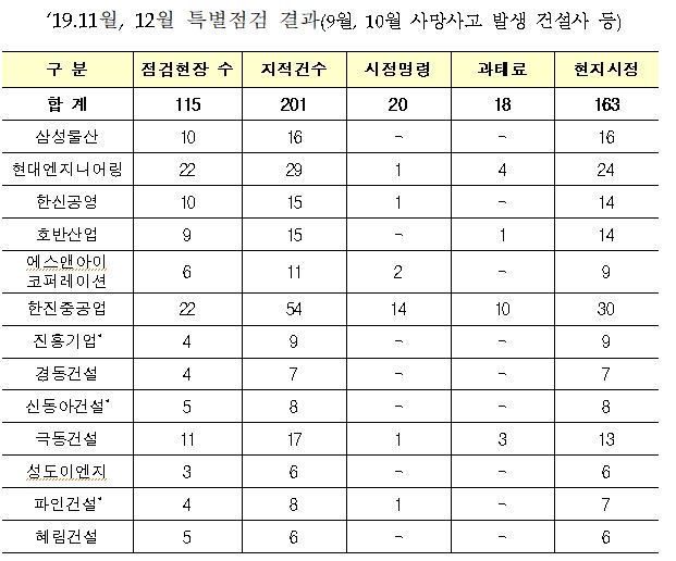 지난해 11월, 12월에는 삼성물산, 현대엔지니어링, 한신공영, 호반산업, 한진중공업 등 13개 회사에서 시공 중인 115개 현장을 대상으로 특별점검을 진행했다. 점검 당시 총 201건의 위법사항이 적발되어 시정을 지시했고, 이 중 콘크리트면의 허용 균열폭 보다 큰 균열을 방치한 채 후속 작업 중이던 건과 고공 작업발판에 안전난간을 설치하지 않고 작업을 진행하던 건과 품질관리 업무를 수행하는 건설기술인을 기준보다 적게 배치한 건 등 20건에 대해서는 벌점을 부과할 예정이다.