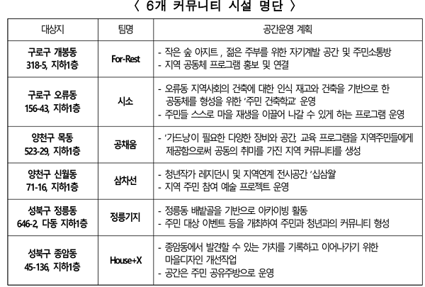 6개 공간은 ▲주민소통방 ▲공유주방 ▲마을 예술 전시공간 ▲가드닝 및 건축 관련 교육과 취미 교류 공간 ▲마을디자인 프로젝트 마을과 아카이빙 활동 공간 등 프로그램이 열리는 공간으로 운영된다. 규모는 30제곱미터에서 83제곱미터이다.