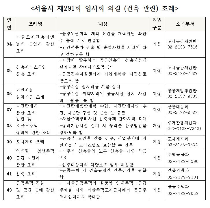 서울시는 지난 20일 개최한 제291회 조례·규칙 심의회에서 50개의 조례안과 규칙안을 심의·의결하고 26일 공포했다. 이중 건축 관련 조례는 약 8건이다.