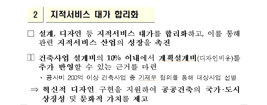 지침에는 설계, 디자인 등의 지적서비스 대가를 합리화하는 내용이 담겼다. 관련 지적서비스 산업의 성장을 촉진하겠다는 것인데, 공사비 200억 이상 건축사업 중 협의를 통해 대상사업을 선별해 건축사업 설계비 10% 이내에서 계획설계비(디자인비용)를 추가 반영할 수 있는 근거를 마련하는 등 혁신적 디자인 구현을 지원해 공공건축의 국가·도시 상징성과 문화적 가치를 제고한다는 방침이다.
