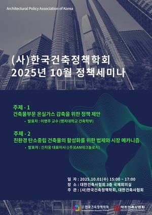 한국건축정책학회와 대한건축사협회가 10월 1일 오후 3시 대한건축사협회 3층 국제회의실에서 정책세미나를 연다.첫 번째 주제는 ‘건축물부문 온실가스 감축을 위한 정책 제안’으로, 명지대학교 건축학부 이명주 교수가 발표한다. 두 번째 주제는 ‘친환경 탄소중립 건축물의 활성화를 위한 법제와 시장 메카니즘’으로, ㈜ENA테크놀로지 신지웅 대표이사가 발표한다.세미나는 한국건축정책학회와 대한건축사협회가 공동 주관한다.