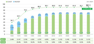 국토교통부와 한국국토정보공사는 ’24년 기준 도시계획현황 통계를 공표했다. 통계에 따르면 국토 면적의 16.5%인 도시지역에 국민의 92.1%가 거주하는 것으로 나타났다.작년 기준 도시지역 면적은 1만 7,639제곱킬로미터로 국토 면적 10만 6,567제곱킬로미터의 16.5% 수준이며, 주민등록인구의 92.1%인 4,715만 명이 도시지역에 거주하고 있는 것으로 조사됐으며, 이는 전년과 동일한 수준이다.전 국토의 토지이용을 나타내는 용도지역은 간척사업 등으로 ’19년 10만 6,211제곱킬로미터 대비 356제곱킬로미터(0.3%↑)