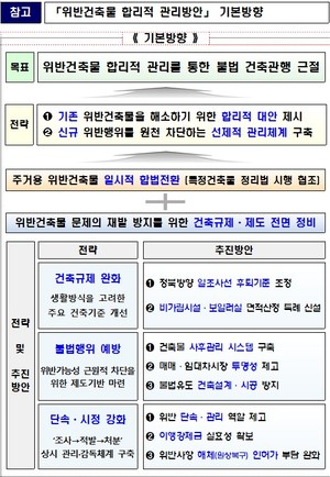 국토교통부가 위반건축물 문제 해결을 위해 ‘위반건축물 합리적 관리방안’을 10월 2일 내놓았다. 핵심은 ▲소규모 주거용 위반건축물 한시적 양성화 ▲건축규제 완화 ▲불법 건축행위 단속·관리 강화다.국토부에 따르면 지난해 말 기준 전국 위반건축물은 약 14만8천 동으로, 2015년 8만9천 동에서 매년 5천∼6천 동씩 증가하고 있다. 이 중 주거용은 8만3천 동이며, 단독·다가구·다세대주택 등 소규모 주거용이 4만6천 동으로 과반을 차지한다. 경남 창원에서는 지난해 불법 근린생활시설의 구조물이 붕괴해 사망 1명, 부상 3명이 발생하는