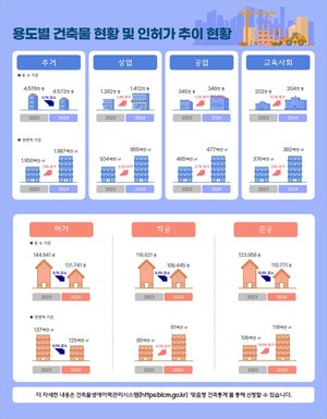 국토교통부는 ’24년도 전국 건축물의 동수는 작년보다 3만 519동(전년 대비 0.4%)이 증가한 742만 1,603동이며, 연면적은 작년보다 8,732만 7,000㎡(전년 대비 2.1%)이 증가한 43억 1,498만 7,000㎡라고 발표하였다.이는 축구장(7,140㎡) 기준 약 1만 2,231개 면적, 잠실 야구장(2만 6,331㎡) 기준 약 3,317개에 달하는 면적이다.수도권은 8,156동(3,912만 8,000㎡) 증가한 207만 5,316동(19억 6,494만 6,000㎡), 지방은 2만 2,363동(4,819만 8,000