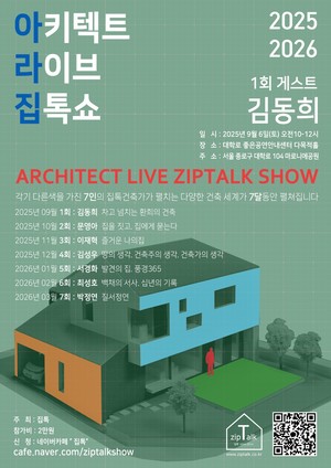 ‘아키텍트 라이브 집톡쇼’가 올 9월부터 2026년 3월까지 대학로 좋은공연안내센터 다목적홀에서 열린다. 주최는 네이버 카페 ‘집톡’으로, 각기 다른 건축 세계를 탐구하는 7인의 건축사가 매달 한 차례씩 이야기를 나눈다.행사는 9월 김동희 건축사(건축사사무소 케이디디에이치)의 ‘차고 넘치는 환희의 건축’을 시작으로 10월 문영아 건축사(이즈모어앤씨 건축사사무소)의 ‘집을 짓고, 집에게 묻는다’, 11월 이재혁 건축사(주.에이디모베 건축사사무소)의 ‘즐거운 나의집’이 이어진다.12월에는 김성우 건축사(건축사사무소 공유)가 ‘땅의 생각