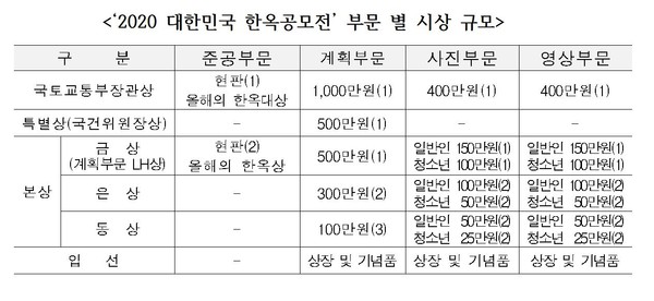 각 부문 별 내용은 다음과 같다. ◆준공 부문=최근 5년 이내에 준공된 한옥을 대상으로 하며, 해당 한옥의 시공자, 건축주, 설계자, 책임목수라면 응모할 수 있다. ◆계획 부문=4인 이내의 팀 또는 개인 자격으로 응모할 수 있으며, 현대 건축재료 및 기술과 융합된 미래형 한옥에 대한 아이디어를 제시하면 된다. ◆사진·영상 부문=일반인과 청소년을 대상으로, 일상에서 발견할 수 있는 한옥의 가치를 독창적인 시각으로 담아낸 작품을 찾는다.