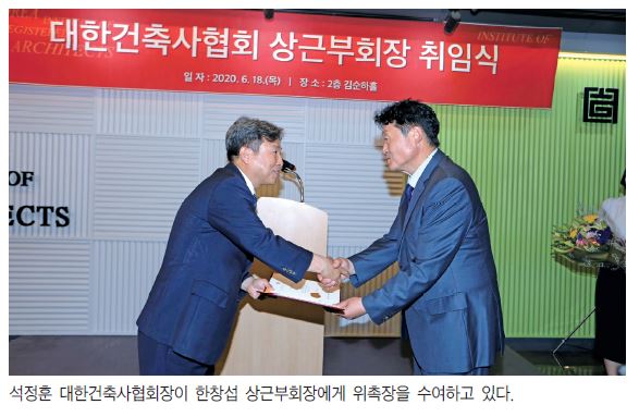 한창섭 상근부회장은 6월 18일 건축사회관 김순하홀에서 취임식을 갖고 취임 당일 업무를 시작했다. 취임식에는 석정훈 대한건축사협회장을 비롯한 임원진, 조태종 건축사공제조합 이사장과 사무처 직원들이 참석해 한창섭 상근부회장의 취임을 축하했다.