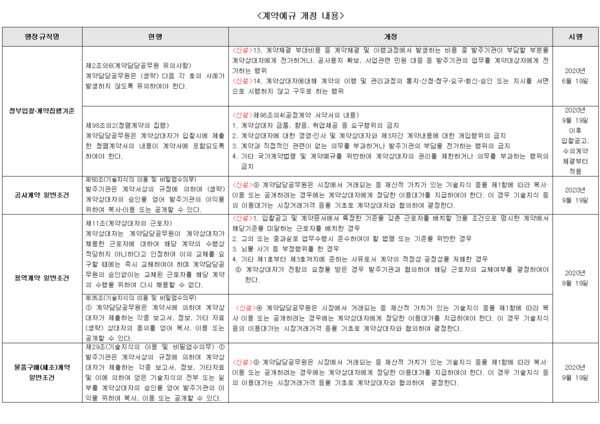 개정‧공포된 계약예규에서는 공공계약 현장에서 발생하는 편법적인 비용‧부담전가 행위를 방지하기 위해 계약담당공무원의 준수사항에 주요한 불공정행위를 열거, 금지행위로 명시했다. 일례로 설계변경 등 계약관련 요청을 서면으로 시행하지 않고, 구두로만 시행하는 불공정행위 등이 금지된다. 계약체결 및 이행과정에서 발생하는 비용 중 발주기관 부담분을 계약 업체에게 전가하는 행위와 장기계속계약에서 공기연장사유 발생 시 간접비 지급을 회피하기 위해 해당차수 계약을 해지하고, 사유 종료 후 신규 계약을 체결하는 행위도 명백한 불공정행위로 명시했다.