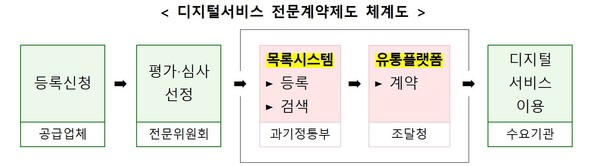 ◆ 디지털서비스 전용 온라인 플랫폼 구축=디지털서비스 검색에서 계약까지 전 과정을 뒷받침하는 디지털서비스 전용 온라인 플랫폼을 구축한다. 선정된 디지털서비스 목록과 관련 정보를 제공하는 ‘목록시스템’과 계약을 편리하게 지원하는 디지털서비스 전용 쇼핑몰 ‘유통플랫폼’을 연계해 수요기관의 편의를 도모한다.