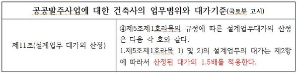 국토부 담당자는 ‘공공발주사업에 대한 건축사의 업무범위와 대가기준 제11조제4항제1호에 따라 리모델링 설계업무와 인테리어 설계업무는 산출된 대가에 1.5배를 적용해야 한다고 답변했다. 담당자는 기존 건축물에 추가적인 리모델링과 인테리어 설계업무를 수행할 경우, 기존 건축물의 실측, 주요구조부에 대한 조사 등 사전업무가 포함돼 설계업무가 추가적으로 가산되므로 1.5배를 더 산정해줘야 하는 것이라고 대가기준 규정의 취지를 설명했다.