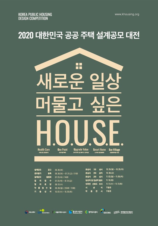 ‘대한민국 공공주택 설계공모 대전’은 올해로 3회째를 맞이해 새로운 일상, 머물고 싶은 ‘H.O.U.S.E’라는 주제로 국내 공공주택의 새로운 패러다임을 제시하고자 마련됐다. ‘H.O.U.S.E’라는 주제는 ▲Health Care(의료 및 건강관리) ▲One's Option(단지별 특화) ▲Upgrade Value(주거가치 업그레이드 및 혁신) ▲Smart Home(스마트 홈 활성화) ▲Eco Village(친환경 마을 조성)로 세분화된다.