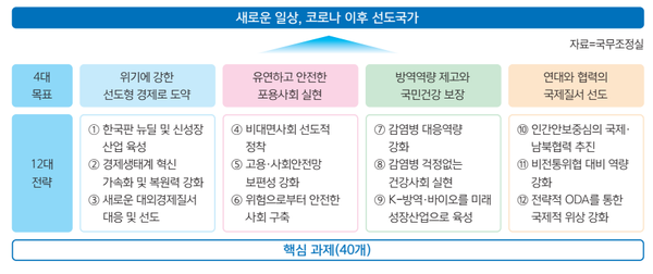 정부는 ▲위기에 강한 선도형 경제로 도약 ▲유연하고 안전한 포용사회 실현 ▲방역역량 제고와 국민건강 보장 ▲연대와 협력의 국제질서 선도 등 4개 목표 아래 12대 전략과 40개 핵심과제를 선정했다.