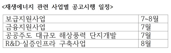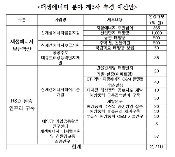 지난 7월 5일엔 산업통상자원부가 제3차 추경예산안이 7월 3일 국회심의를 통과함에 따라 태양광, 풍력 등 재생에너지 분야 6개 사업에 총 2710억 원 규모의 예산을 추가로 투자한다고 발표했다. 이번 재생에너지 분야 추경 예산은 태양광·풍력 보급·확산 및 관련 산업 육성을 위한 사업들로 구성됐다.