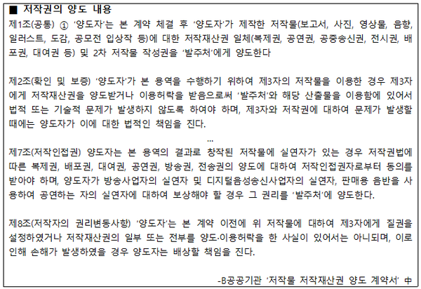 양도계약서에 따르면, 양도자가 제3자의 저작물을 이용한 경우 해당인에게 저작재산권을 양도받거나 이용허락을 받아 ‘발주처’ 등이 해당 결과물을 이용할 때 법 또는 기술적 문제가 발생하지 않아야 하며, 문제가 발생할 경우 이에 법적 책임을 진다. 또 저작권법에 따른 복제·배포·대여·공연·방송권 등의 양도에 대해 저작인접권자로부터 동의를 받는 것도 양도자의 역할이며, 해당 저작물의 일부 또는 양도·이용 허락을 한 사실이 있어서도 안 되고, 손해가 발생할 경우 양도자는 이를 배상할 책임을 지게 된다.