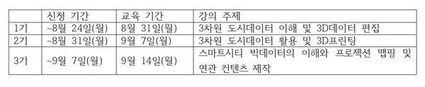 또한 교육생들이 원하는 과정만 골라 수강할 수 있도록 각각 다른 주제로 1기부터 3가까지의 과정을 운영한다. 1~3기 주제는 각각 3차원 도시데이터 이해 및 3D데이터 편집, 3차원 도시데이터 활용 및 3D프린팅, 스마트시티 빅데이터의 이해와 프로젝션 맵핑 및 연관 컨텐츠 제작이다.