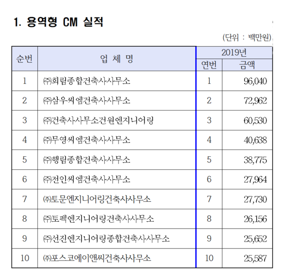 한국CM협회가 46개 신청업체를 대상으로 평가한 2020년 CM능력평가 결과를 8월 31일 발표했다. ㈜희림종합건축사사무소(960억 원)가 1위를 차지했으며, ㈜삼우씨엠건축사사무소(730억 원)와 ㈜건축사사무소 건원엔지니어링(605억 원)이 그 뒤를 따랐다.