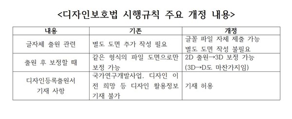 3D 입체파일로 도면을 제출한 뒤 보정을 원하는 경우에는 2D 파일로 된 도면을 제출하는 것이 가능해진다. 반대로 2D 파일로 도면을 제출한 경우에도 3D 입체파일 도면에 보정해 제출하는 것도 허용된다. 종전에는 디자인을 출원한 후 보정을 하려면 출원한 도면의 제출파일 형식과 같은 파일 형식만 제출할 수 있었다.