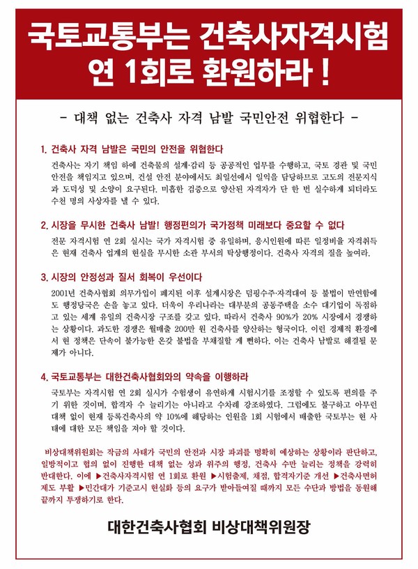 대한건축사협회 비대위는 요구사항으로 ▶건축사자격시험 1회로 환원 ▶시험출제, 채점, 합격자 기준 개선 ▶건축사 면허제도 부활 ▶5년제 인증건축대학 사후평가제도 도입 등을 촉구했다. 건축시장 정상화를 위해 필요한 사항 및 개혁 요건이라고 설명했다.