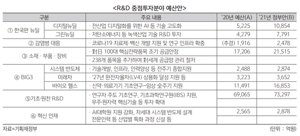 예산안에 따르면 내년 R&D 예산은 올해 24조2,000억 원보다 12.3% 증액한 27조 2000억 원으로 편성하고, 한국판 뉴딜, 감염병 대응, 소재·부품·장비, BIG3(시스템반도체·미래차·바이오헬스), 기초·원천R&D, 혁신 인재 양성 등 6개 분야에 13조2,000억 원을 집중 투자하기로 했다. 6개 분야 R&D 예산은 올해 11조 원 보다 20.1% 늘어나게 된다.