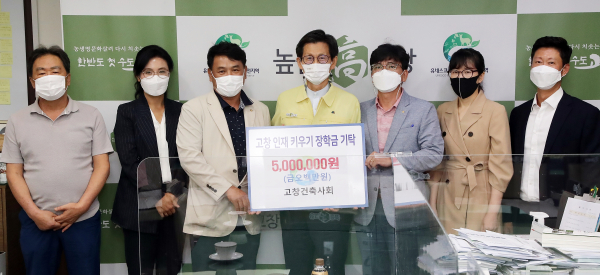 고창지역건축사회는 지난 9월 10일 지역인재육성을 위해 고창군 장학재단에 장학금 500만 원을 기탁했다. 김상수 고창지역건축사회장은 “고창의 미래를 이끌어갈 아이들을 위한 장학사업에 고창지역 건축사들도 동참하고 싶었다”며 “고창사람 키우기에 작은 마음을 보탤 수 있어 기쁘다”고 밝혔다.