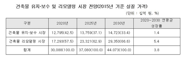 건축물 유지‧보수 시장은 2020년 12조7,950억 원, 2025년 13조7,590억 원, 2030년 14조7,230억 원으로 추정했다. 2000~2017년간 건축 시장은 실질적으로 신축이 주도한 만큼 건축물 유지‧보수 시장은 지난 17년간 역성장 및 저성장했지만, 중장기적으로는 활성화될 가능성이 크다는 분석이다.