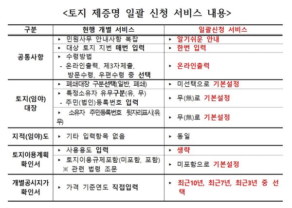 토지 관련 증명 서류는 토지(임야)대장, 지적(임야)도, 토지이용계획확인서, 개별공시지가확인서 등이 있다. 그동안은 동일 물건에 대해 이 같은 증명 서류들을 각각 다른 화면에서 같은 내용을 반복 입력하고 여러 번 신청해야 했다. 특히 토지대장의 경우 '폐쇄대장 구분 선택', '특정 소유자 유무구분' 등 이해하기 어려운 항목들에 헷갈린다는 지적이 있었다.