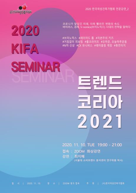 오는 11월 10일 오후 7~10시에도 다른 전문강연이 계획돼 있다. 해당 랜선 세미나 ‘2020 소비 트렌드 동향과 분석(최지혜, 서울대 소비트렌드 분석센터 연구위원)’는 코로나가 앞당긴 미래, 빨라진 변화속도에 맞춘 전략을 중심 내용으로 한다. 강연은 ZOOM 화상 강연으로 진행된다.