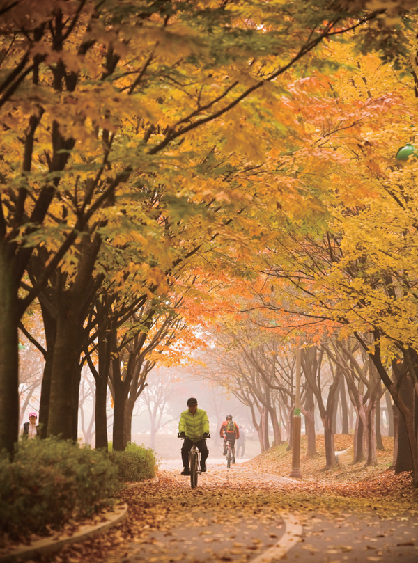 늦가을 일산 호수공원. 아침 안개가 자욱한데도 산책을 하거나 아침 운동을 하는 사람들로 붐빈다. 낙하한 잎들이 주단처럼 깔려 있는 길, 단풍나무들이 터널을 만든 듯한 사잇길에서 반바지 차림으로 뛰는 이가 보인다. 그의 숨소리, 발자국 소리가 퍽 고무적으로 들린다. 나뭇잎들이 울긋불긋 물들어가는 가을 길목, 힘차게 나아가는 모습에 생기가 흘러넘친다.