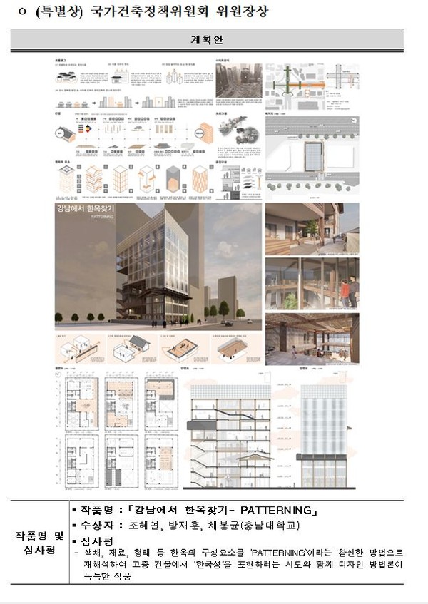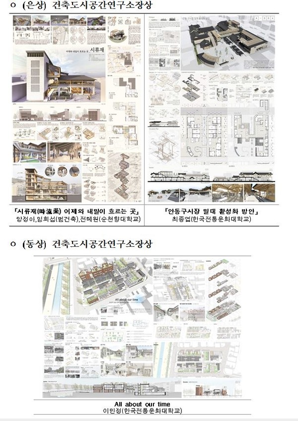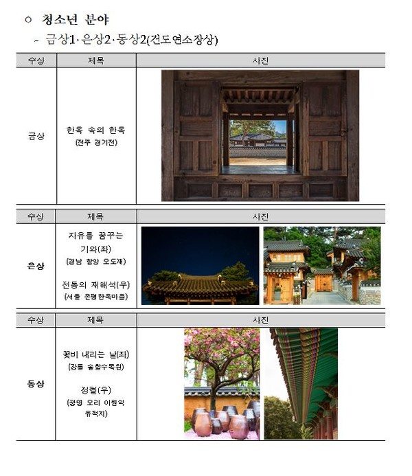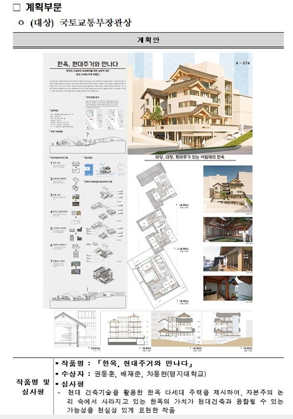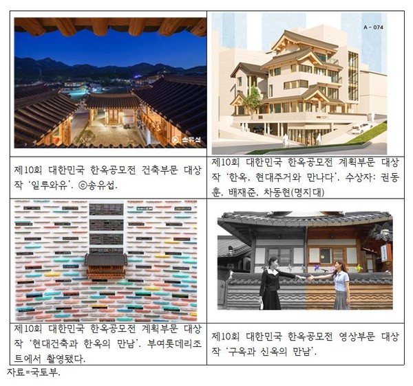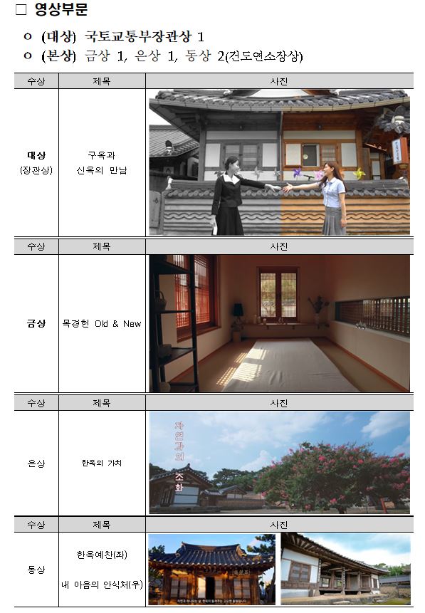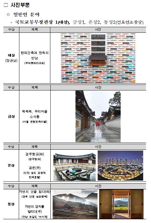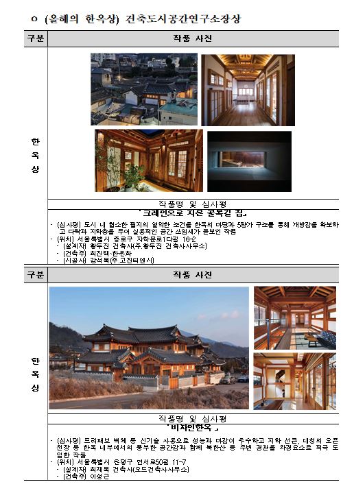 계획부문에는 ‘한옥, 현대주거와 만나다’가, 사진부문에는 ‘현대건축과 한옥의 만남’이, 영상부문에는 ‘구옥과 신옥의 만남’이 각각 대상을 차지했다. ‘한옥, 현대주거와 만나다’는 현대 건축기술을 활용한 한옥 다세대 주택을 제시해 호평을 받았다. ‘현대건축과 한옥의 만남’은 현대건축과 한옥의 요소를 조화로우면서 다채롭게 표현한 사진이라는 평가를 받았다. ‘구옥과 신옥의 만남’은 전통과 현대의 만남을 구옥과 신옥이라는 인물로 흥미롭게 한옥의 가치를 풀었다. 수상작들은 ‘대한민국 한옥 공모전 누리집’(competition.hanokdb.kr)’에서 확인할 수 있다.
