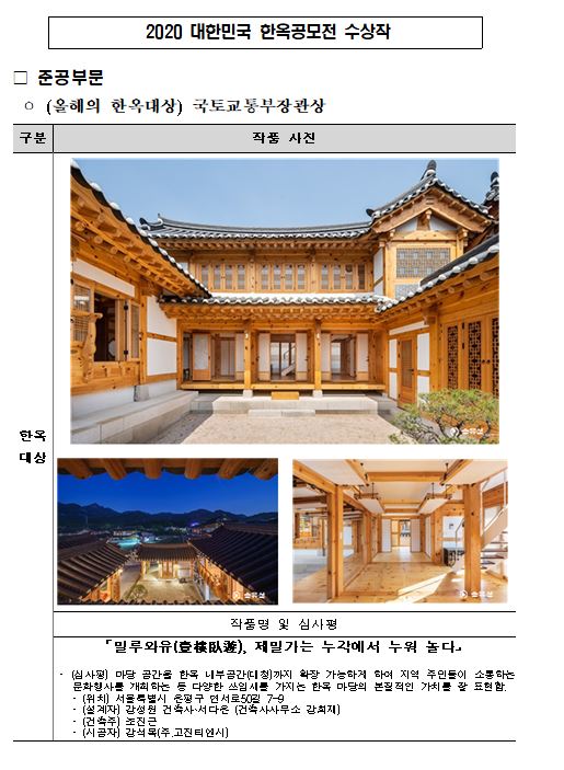 대한민국 한옥공모전은 한옥의 가치를 재조명하기 위해 2011년부터 매년 국토부에서 진행하는 행사다. 올해는 국토교통부가 주최하고 건축도시공간연구소가 주관했으며 준공·계획·사진·영상 등 4개 부문으로 진행됐다. 접수된 총 668점의 작품 중 준공부문 3점, 계획부문 17점, 사진부문 25점, 영상부문 6점 등 총 51점 작품이 최종 선정됐다.