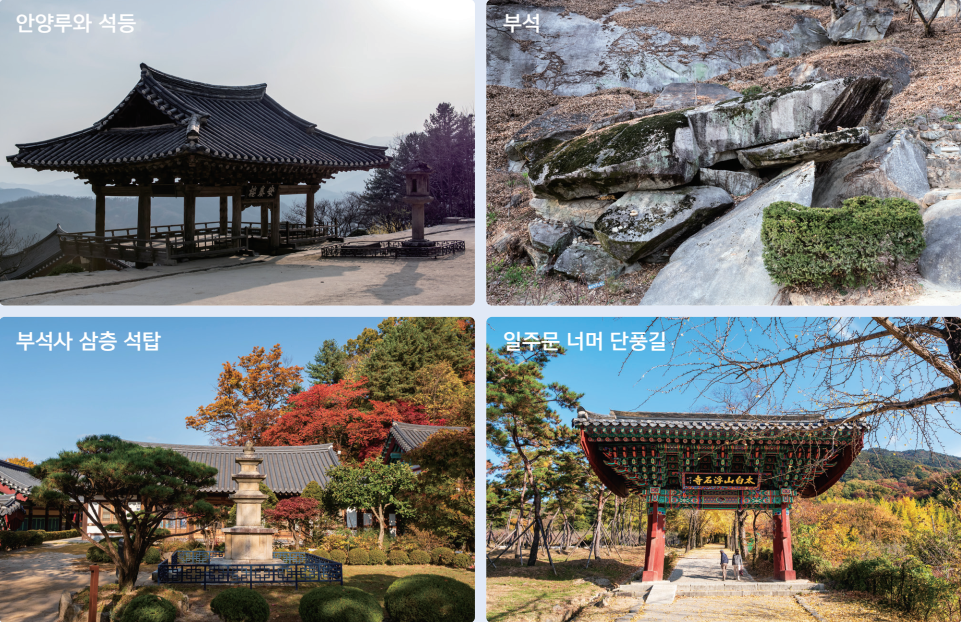 안양루는 무량수전 앞마당 끝에 위치한 누각이다. 규모는 정면 3칸, 측면 2칸이며 팔작지붕 건물이다. 건물의 위쪽, 아래쪽 편액이 다르다. 난간 아랫부분 편액은 ‘안양문’, 위층 마당 쪽은 ‘안양루’라고 씌어 있다. 누각 내부에 시문 현판이 담겨 있다. 2층 공포와 공포 사이로, 여러 개의 금색불상이 가부좌를 틀고 있는 모습이 보인다.