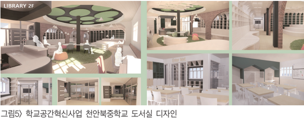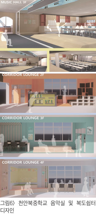 음악실은 복도공간도 포함해 가변적 확장성을 고려하면서 아레나(arena) 형식으로 디자인 됐다. 음악 수업 뿐 아니라 다양한 댄스 및 동아리 활동들, 방과 후의 친구들과의 교류공간으로도 활용될 수 있게 고려한 점이 특징이라 할 수 있다. 복도쉼터도 다른 컬러코드를 적용해 학생들의 의견 및 꿈과 끼를 표출할 수 있게 디자인되었는데, 특히 다문화 학생들과 한국 학생들 간의 상호이해와 교류를 도모할 수 있도록 하였다. 실시설계를 마치고 곧 공사에 들어간다고 하고, 충남교육청에서는 필자와 같은 촉진자가 디자인 감리 과정에 참여할 수 있도록 모색 중인 상태이다.