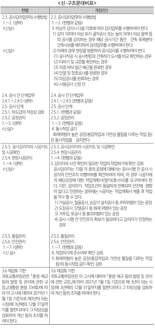 이번 개정안은 ‘선 검토 후 작업 원칙’으로 공사 감리자가 작업 시행 전 작업계획서를 확인‧검토하도록 했다. 공사 감리자는 건축현장에서 추락‧화재 등 사고발생 위험이 높은 위험공정 작업 시에는 작업내용, 안전대책 등을 담은 작업계획서를 사전에 검토‧확인한 후 작업을 시행해야 한다. 공공공사에서는 2019년 4월부터 이미 시행하고 있으며, 앞으로는 인명 및 재산 피해를 예방하기 위해 민간공사에도 확대 적용한다.