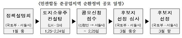 공모참여 부지는 LH‧SH가 사업 추진 적절성을 사전 검토한 후, 국토부‧서울시 합동 후보지 선정위원회에서 입지 적합성, 시설 노후도, 사업 효과성 등을 종합해 3월말 후보지로 최종 선정할 계획이다. 후보지로 선정되면 LH‧SH와 토지주가 시행방식, 사업계획 등을 협의하고, 양해각서를 체결하는 등 사업을 본격적으로 추진한다.