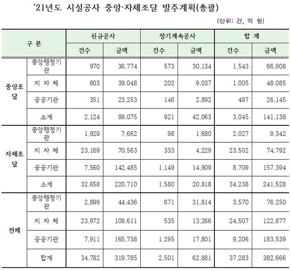 2021년 공공부문 시설공사 발주계획을 보면 중앙행정기관은 4조4,436억 원으로 지난해 4조2,807억 원 대비 3.8% 증가했다. 주요 발주기관은 국토교통부 1조7,307억 원, 해양수산부 1조5,170억 원, 해양경찰청 2,393억 원, 교육부 2,343억 원이다.