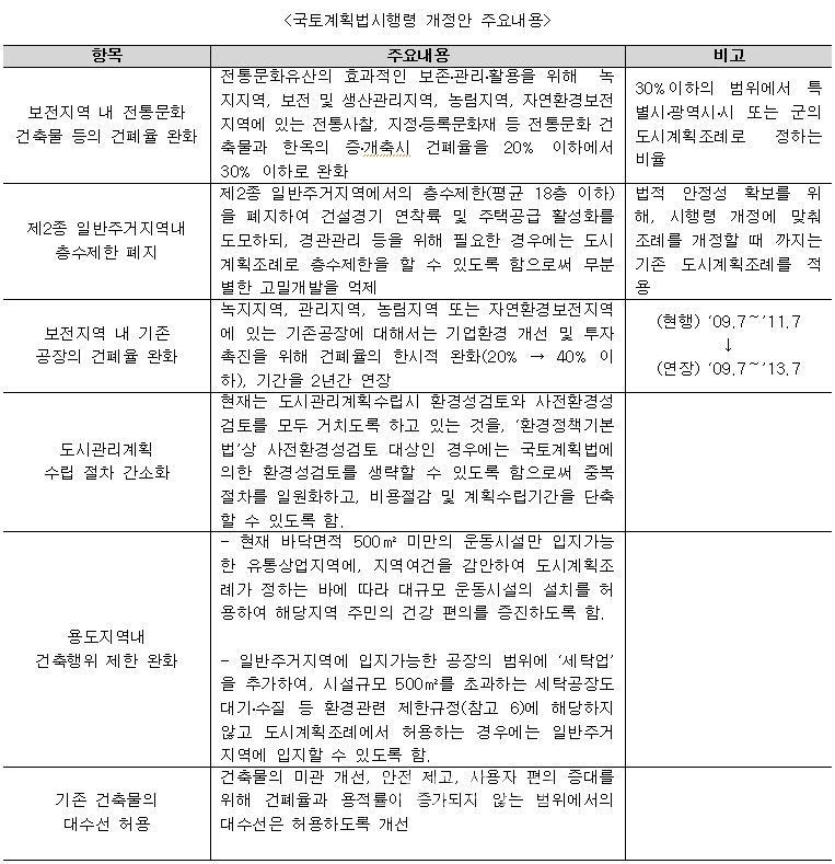 또한 제2종 일반주거지역에서의 층수제한(평균 18층 이하)을 폐지했으며, 녹지지역, 관리지역, 농림지역 또는 자연환경보전지역에 있는 기존공장에 대해서는 기업환경 개선 및 투자 촉진을 위해 건폐율의 한시적으로 완화되며, 도시관리계획 수립 절차도 간소화된다.