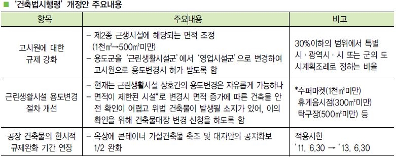 이밖에 공장 건축물의 한시적 규제완화 기간을 2011년 6월 30일에서 2013년 6월 30일로 연장한다. 아울러 옥상 콘테이너 가설건축물 축조 및 대지안의 공지확보를 1/2로 완화했다.
