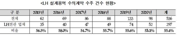 최근 6년 동안 한국토지주택공사(이하 LH)의 설계용역 수의계약 중 절반 이상은 퇴직한 LH 직원을 영입한 업체에서 수주한 것으로 나타났다. LH 임직원에 대한 재취업 대상을 확대하고, 중간관리직 이상의 LH 전관 재취업 현황을 모두 공개해야 한다는 지적이 나온다.