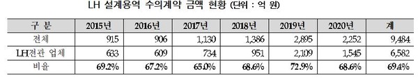 설계업무의 수의계약 규모는 2015년 633억 원이었지만 2020년 1,545억 원으로 2배 이상 증가했다. 2019년에서 2020년도의 LH 전관 영입 업체가 수주한 사업 건수와 사업금액 증가가 두드러졌고, 특히 2019년도는 전체 계약 금액 2,895억 원 중 2,109억 원(72.9%)을 LH 전관 업체가 독식하다시피 했다.