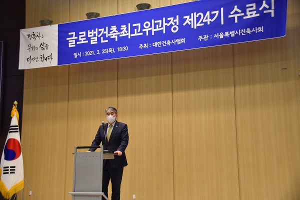 서울특별시건축사회가 주관하는 글로벌건축최고위과정(GAEC) 제24기 수료식이 3월 25일 건축사회관 1층 대강당에서 개최되었다. 코로나19 사회적 거리두기 단계가 격상되면서 강의가 연기돼 지난해 12월 개최 예정이었던 제24기 수료식이 이날로 옮겨진 것이다.