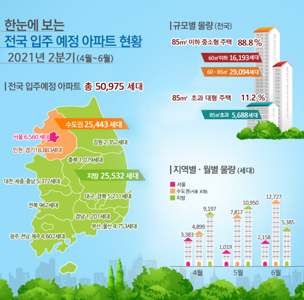 국토교통부는 올해 전국 입주 예정 아파트는 5만975가구로 집계됐다고 4월 16일 밝혔다. 수도권 입주 물량은 2만5443세대이며 이중 서울에는 6560세대가 입주한다.