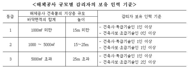 다만, 해체공사감리자 모집공고일(5월 10일) 현재 업무정지나 휴업 중인 경우나 해체공사감리자 모집공고일로부터 1년 이내 업무 정지 처분 이상의 행정처분을 받은 경우는 등재에서 제외된다. 또 서울시는 해체공사감리자를 지정할 때 해체공사감리 업무에 관한 교육을 받은 자를 우선해 지정한다. 따라서 해체공사감리 업무에 관한 교육을 반드시 이수해야 해체감리자로 선정되고, 미이수자는 등재가 제외된다.