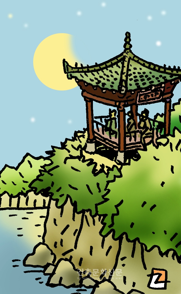 피서는 요산요수(樂山樂水), 취향 따라 다르겠지만 한국민의 불변 1위는 동해안이다. 관동팔경은 동해의 보물이고, 빼어난 경승에 정자를 있어 그 운치를 더하고 있다. 정자는 ‘누(樓) 정(亭) 대(臺) 헌(軒)’ 등으로 불리는데, 특별한 규정은 없으나 누가 공적 건물이라면 정은 사적공간일 확률이 높다. 삼척 죽서루, 강릉 경포대 진주 촉석루, 밀양 영남루 등 큰 규모의 정자는 모두 관정이다. 경승지가 없을 때는 네모꼴 못을 파 땅을 삼고 원형의 섬으로 하늘을 삼아 그 속에 정자를 두었으니, 남원 광한루와 그에 달린 영호정이 대표적이다. 못에 연을 심으면 연지(蓮池)가 되고, 그냥두면 달이 비친다 하여 ‘월지(月池)’라 불렀다. 경포대엔 여섯 개의 달이 있다. 하늘과 바다, 호수와 술잔에 각 하나씩 그리고 임의 눈동자에 비친 달이 둘이다. 뿐만 아니라 임의 가슴에 뜨는 보이지 않는 달(심월(心月)도 있다니 이쯤이면 신선이 따로 없다.