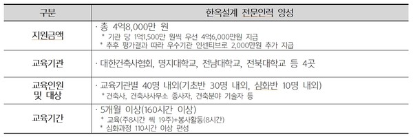교육대상은 건축사, 건축사사무소 종사자, 건축분야 기술자로 각 교육기관의 교육생 선정기준에 따라 선정할 예정이다. 관련된 자세한 사항은 국가한옥센터 누리집(www.hanokdb.kr)에서 확인하면 된다.