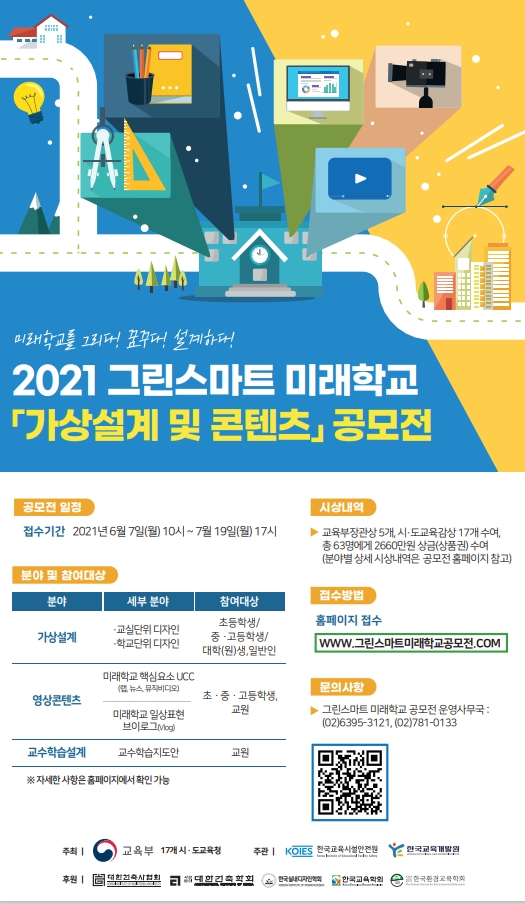 교육부와 전국 17개 시·도교육청이 주최하고 한국교육시설안전원, 한국교육개발원이 주관하는 ‘2021 그린스마트 미래학교 가상설계 및 콘텐츠 공모전’이 다음 달 19일까지 온라인으로 진행 중이다.