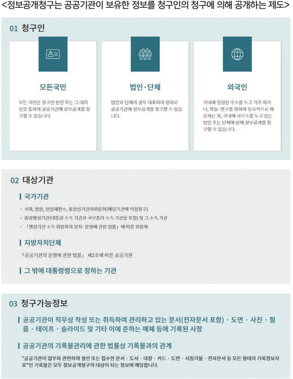 대한민국의 주권은 국민에게 있고, 모든 권력은 국민으로부터 나온다. 공무원은 국민에 대한 봉사자일 뿐만 아니라 국민에 대하여 책임을 진다. 확 가슴에 와닿는 당연한 이 말은 대한민국 최고 상위법인 헌법에 규정되어 있다. 행정기관이 보유·관리하고 있는 각종 정보는 누구의 것일까? 정보를 보유하는 기관의 것인가? 아니면 국민의 것인가?